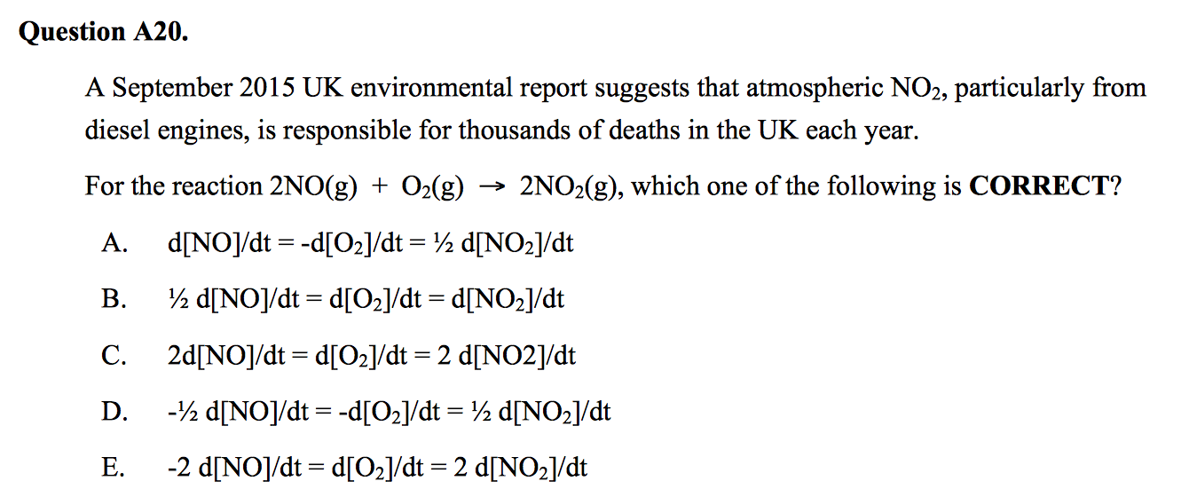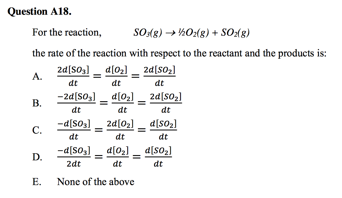 [math]Rate = \frac{1}{{\frac{1}{2}}}\frac{{d\left[ {{O_2}} \right]}}{{dt}} = \frac{1}{1}\frac{{d\left[ {S{O_2}} \right]}}{{dt}} =  - \frac{1}{1}\frac{{d\left[ {S{O_3}} \right]}}{{dt}}[/math]
