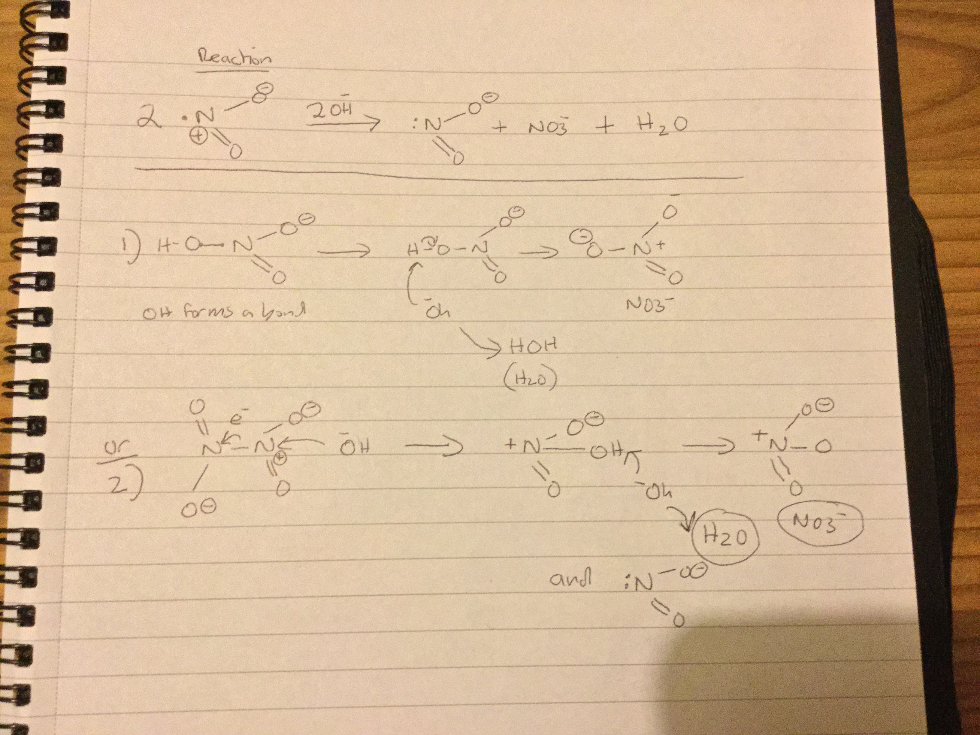 In the first mechanism I just reacted one of the N20 molecules with hydroxide. The hydroxide attaching to the Nitrogen and is then deprotenated  by the second OH-  I now have H20 and N03- but it doesn't explain how the second N20 molecule ends up with a second electron on the Nitrogen.