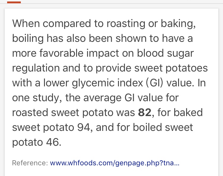 Put into practice, test your blood sugar respectively after steaming sweet potatoes for 15 minutes,25 minutes, and 30 minutes or even longer . You will find out the longer you steam it, the higher the GI it has.