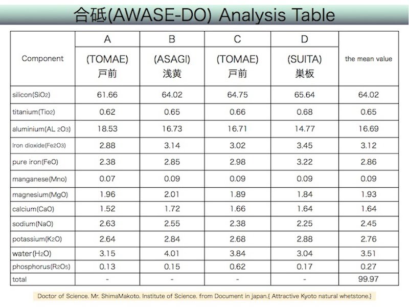 These stones have been studyed intensly in Japan because they are unique and some of the finest natural honing/polishing stones nature gifted mankind....But they have been studyed from a geological point of wiev...and a practical point...i did not manage to find any info about the chemestry involved.