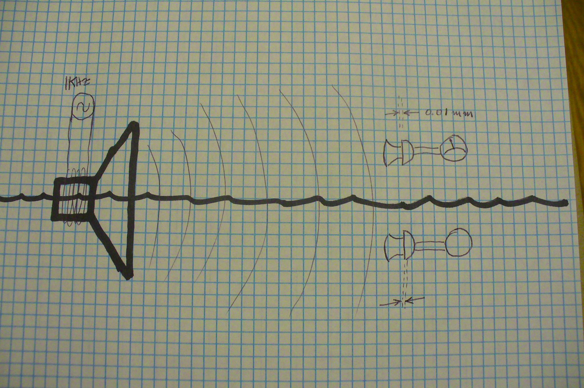 The wave of a half submerged in water loudspeaker is received by a dry microphone as 1 Pascal sound pressure level SPL. Its diaphragm vibrates say 0.01mm in amplitude.