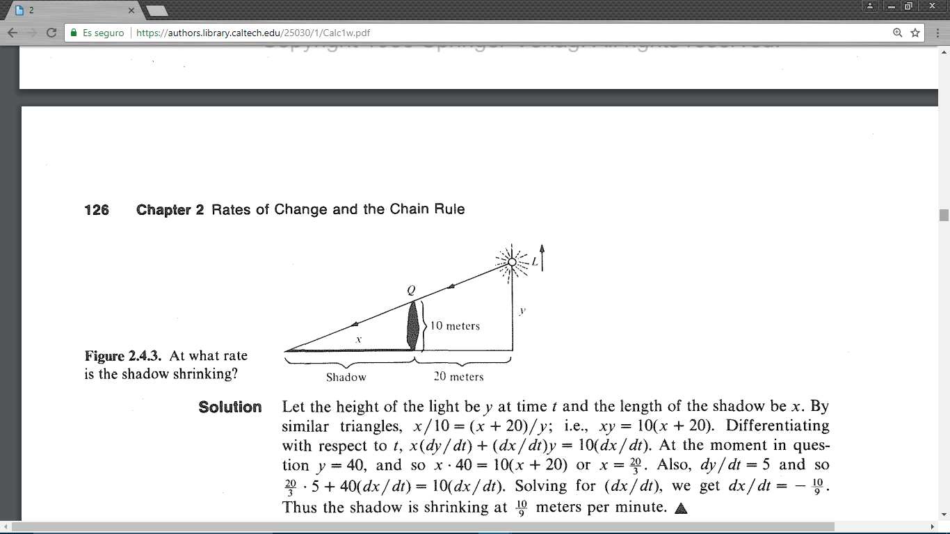 Then the book gives the answer that I don't understand. It reads: Let the height be y at time t and the lenght of the shadow be x. By similiar triangles, x/10=(x+20)/y; i.e., xy=10(x+20).The explanation goes on but I only want to know about the similar triangles part. I don't know where the equation and the 10 and 20 come from. Just that, I have no problem with the rest. Thank you in advance.image.thumb.png.cf0d91f9184a7163b24b8fb18ec5a622.png