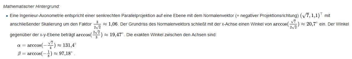 • Eine Ingenieur-Axonometrie entspricht einer senkrechten Parallelprojektion auf eine Ebene mit dem Normalenvektor (= negativer Projektionsrichtung) (7,1,1)⊤{\displaystyle ({\sqrt {7}},1{,}1)^{\top }}{\displaystyle ({\sqrt {7}},1{,}1)^{\top }} mit anschließender Skalierung um den Faktor 322≈1,06{\displaystyle {\tfrac {3}{2{\sqrt {2}}}}\approx 1{,}06}{\displaystyle {\tfrac {3}{2{\sqrt {2}}}}\approx 1{,}06}. Der Grundriss des Normalenvektors schließt mit der x-Achse einen Winkel von arccos⁡(722)≈20,7∘{\displaystyle \arccos({\tfrac {\sqrt {7}}{2{\sqrt {2}}}})\approx 20{,}7^{\circ }}{\displaystyle \arccos({\tfrac {\sqrt {7}}{2{\sqrt {2}}}})\approx 20{,}7^{\circ }} ein. Der Winkel gegenüber der x-y-Ebene beträgt arccos⁡(223)≈19,47∘{\displaystyle \arccos({\tfrac {2{\sqrt {2}}}{3}})\approx 19{,}47^{\circ }}{\displaystyle \arccos({\tfrac {2{\sqrt {2}}}{3}})\approx 19{,}47^{\circ }}. Die exakten Winkel zwischen den Achsen sind:
