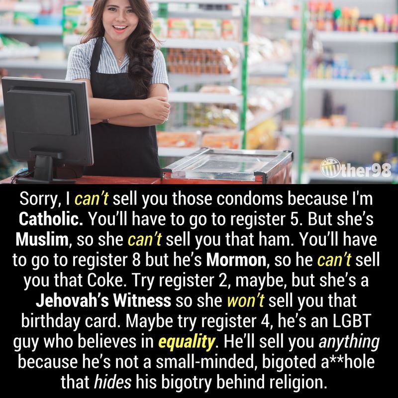 Come on, Phi, this was never about religion; the baker simply did not agree with the lifestyle choices made by the couple ordering the cake.