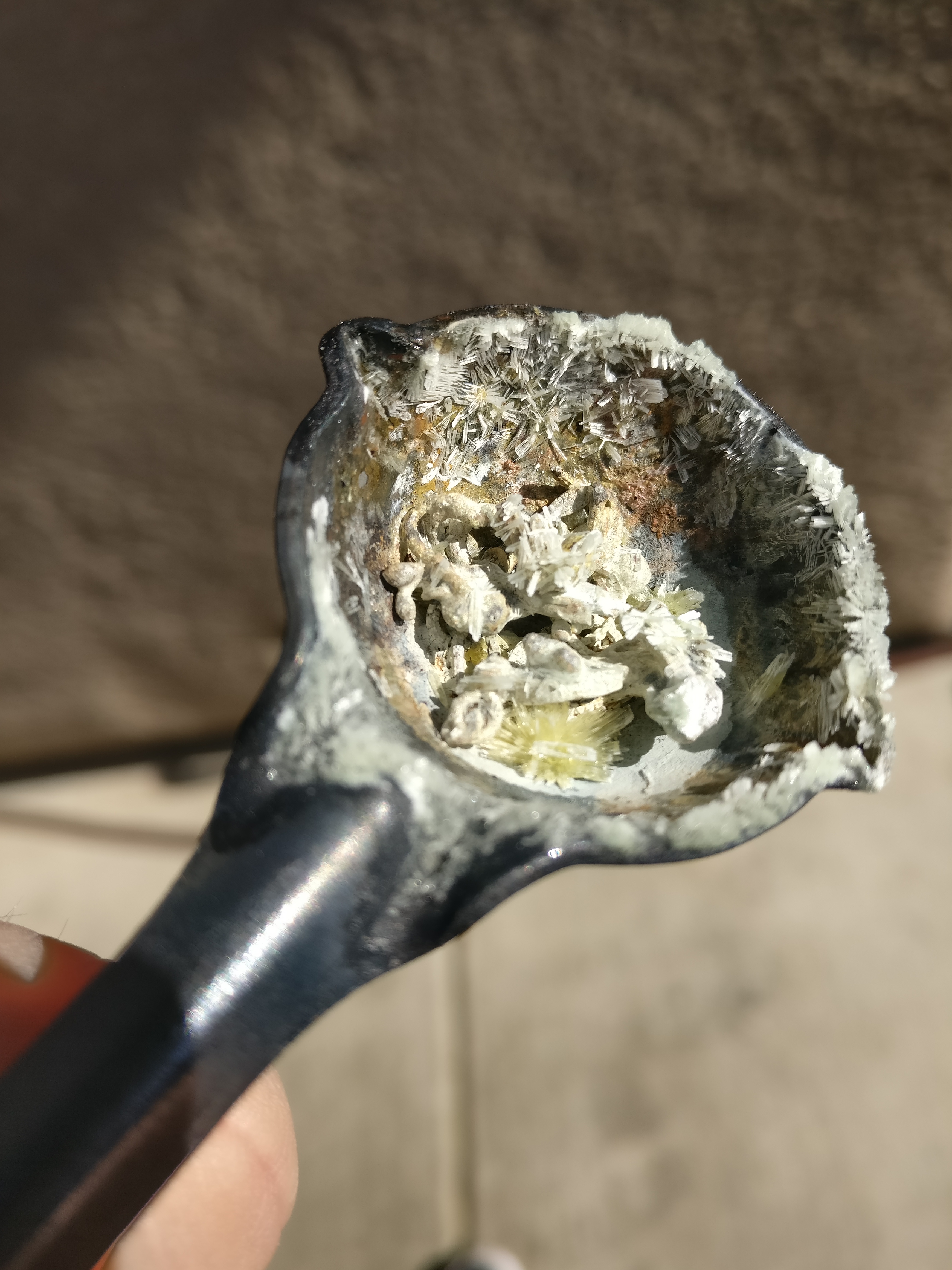 Yesterday i was melting stuff in an iron "crucible" for no specific reason. Today I was surprised to have found several different types of crystals growing on top of some silver metal I had left in the crucible the day before. What I'm wondering now is what exactly can this possibly be? In order to get an idea of what it could be I will list everything that has been melted/burned in it: