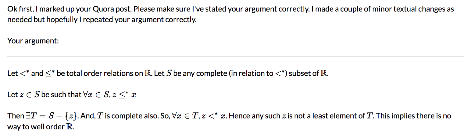 Well thanks, wtf. The real idea behind my effort is that I've always noticed that when you try to come up with a well ordering for the reals there is always a set who's definition is the very thing that violates the ordering. My use of intervals is not a good example. Let me see if I can come up with a construction that works. Let me try this: Suppose A has a l.e. a with respect to <*. Now comsider B=A\{a}. Then a is not the l.e. of B. Your WO hyp says B has a l.e. b and a<b since b is inA. A and B are dense so there exists an x such that     a<x<b . x can't be in B..... Anyway, this all leads to a contradiction. I would say the WO says all subsets of the reals defined in relation to <* have a l.e. in telation to <*. So, I think I can speak of them as interval in relation to <*.  I hope I don't sound like I'm going around in circles. Yes, I need more thought on this; no doubt you'll tell me I need a lot more thought....OK, now I think I know what you are saying: If any set is WO it is turned into the form a1.a2, a3, ..., but I'm saying for any WO there will always exist a set that can't be turned into this structure.