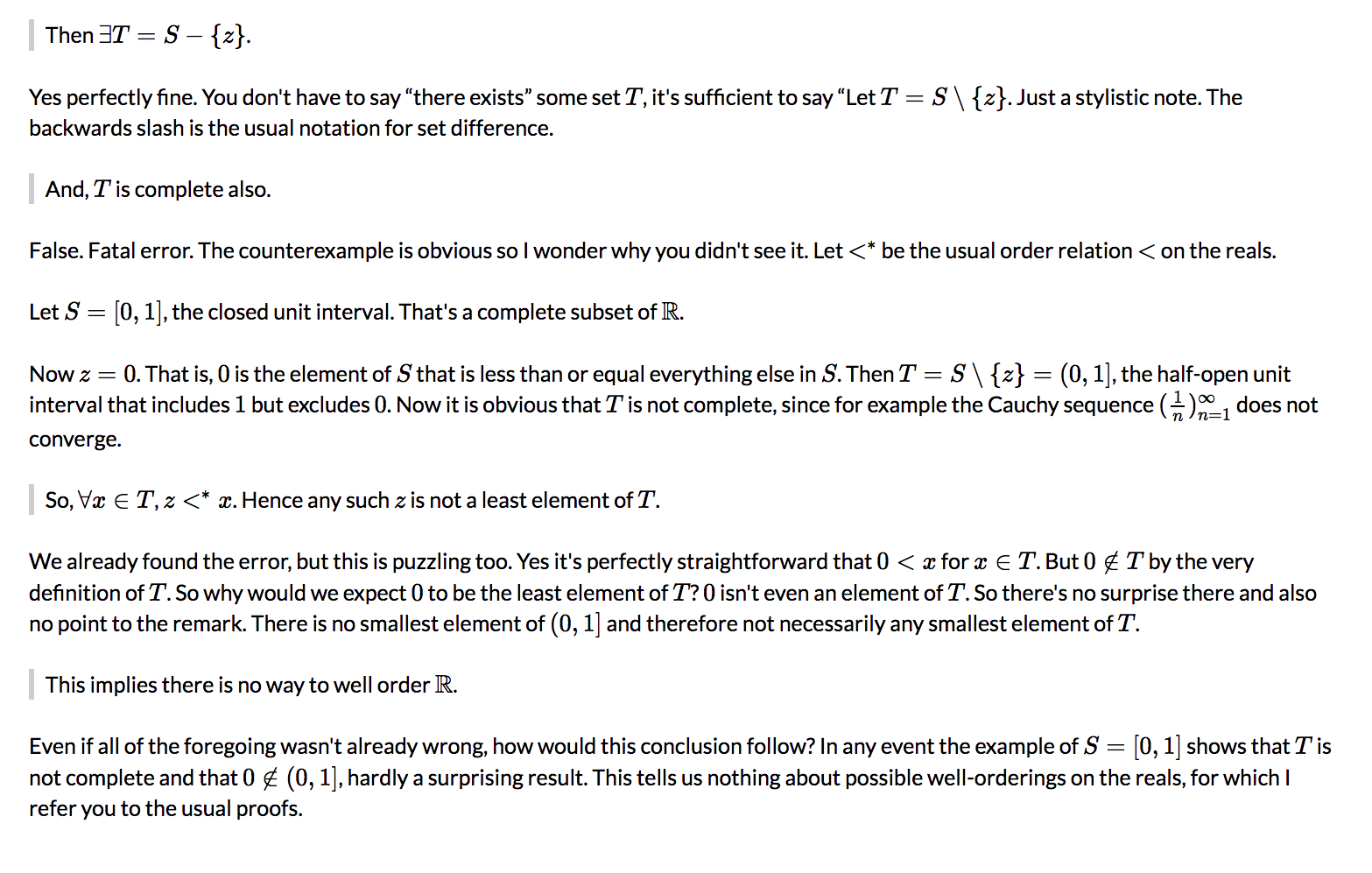 I gave an answer using a library computer and didn keep track of the time limit. It was completely lost. Iĺl have to do it again. Iḿ thinking Iḿ sticking to my original statements. As I said before if a order relation, <*, WOs the set of reals there has to be a l.e. according to <* in every possible subset of the reals. If every possible subset cannot be constructed there is no guarantee a subset made up of elements each from each subset of the reals exists either.
