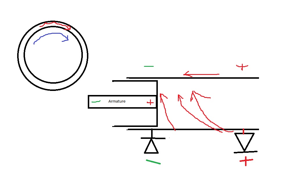 They would only be flowing from plus to minus inside the conductor. The attraction would come from the positive diode when attached to a circuit. The neg diode may have to be away from the area where the armature is rotating. So somewhere in between the positive charged end and the point where the armature ends inside the tube is where the neg diode would have land. I drew it incorrectly in the picture. This is to allow electrons that are not completely pulled into the rotating field within the conductor to be attracted out into the circuit for use. Kind of like its own eddy current.