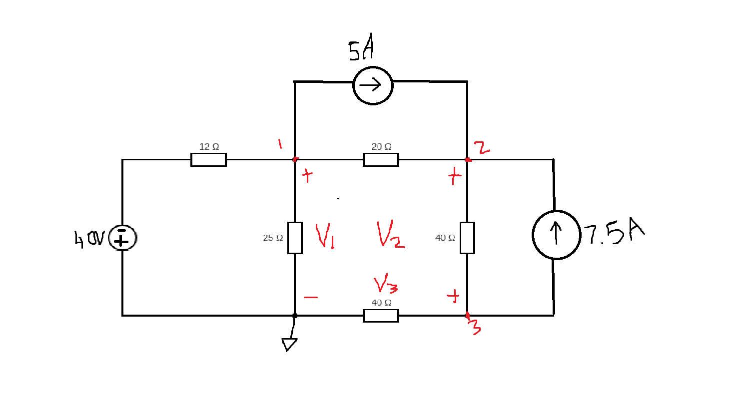 You meant (V1-V2) /20 - 5 + (V2-V3) /40 -7.5.