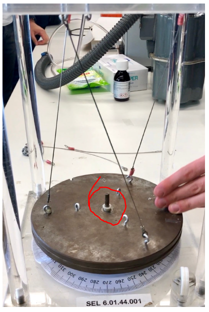 If I understand your device correctly, the (horizontal?) disk we see in the pic is the 'bob' of the pendulum, which is suspended by the three wires we see.