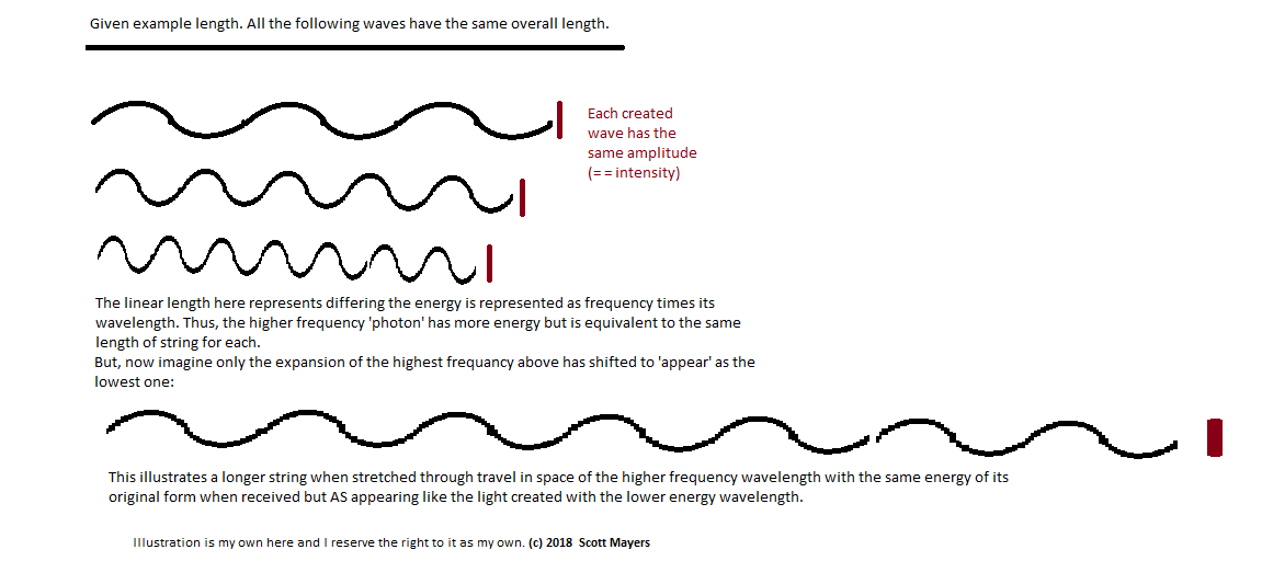 For example, let's say that you have a length of a fixed string. When any color (frequency) is initiated, each string has identical length. But since each frequency has different energy, this can be understood as the same length of string being used to create the wave but will alter the linear length presuming no difference in intensity represented by its altitude. Here I've inserted an illustration using Windows "Paint":