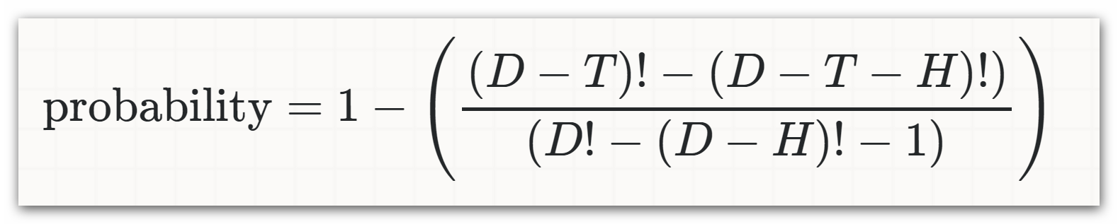I am not sure why I am asking the impossible when D=48, T=3, H=3? There must an equation to correctly calculate the probability that can be universalized to whatever value I choose for T and H as long as T > 0; H > 0; D ≥ T, D ≥ H. If I violate these assumptions, no equation can, of course, calculate the impossible. But it's like saying x/y is not legit, because in case of y=0 there is no result. I just would like to know a way to quickly calculate the odds in other legit cases, for example, D=48, T=12, H=5.