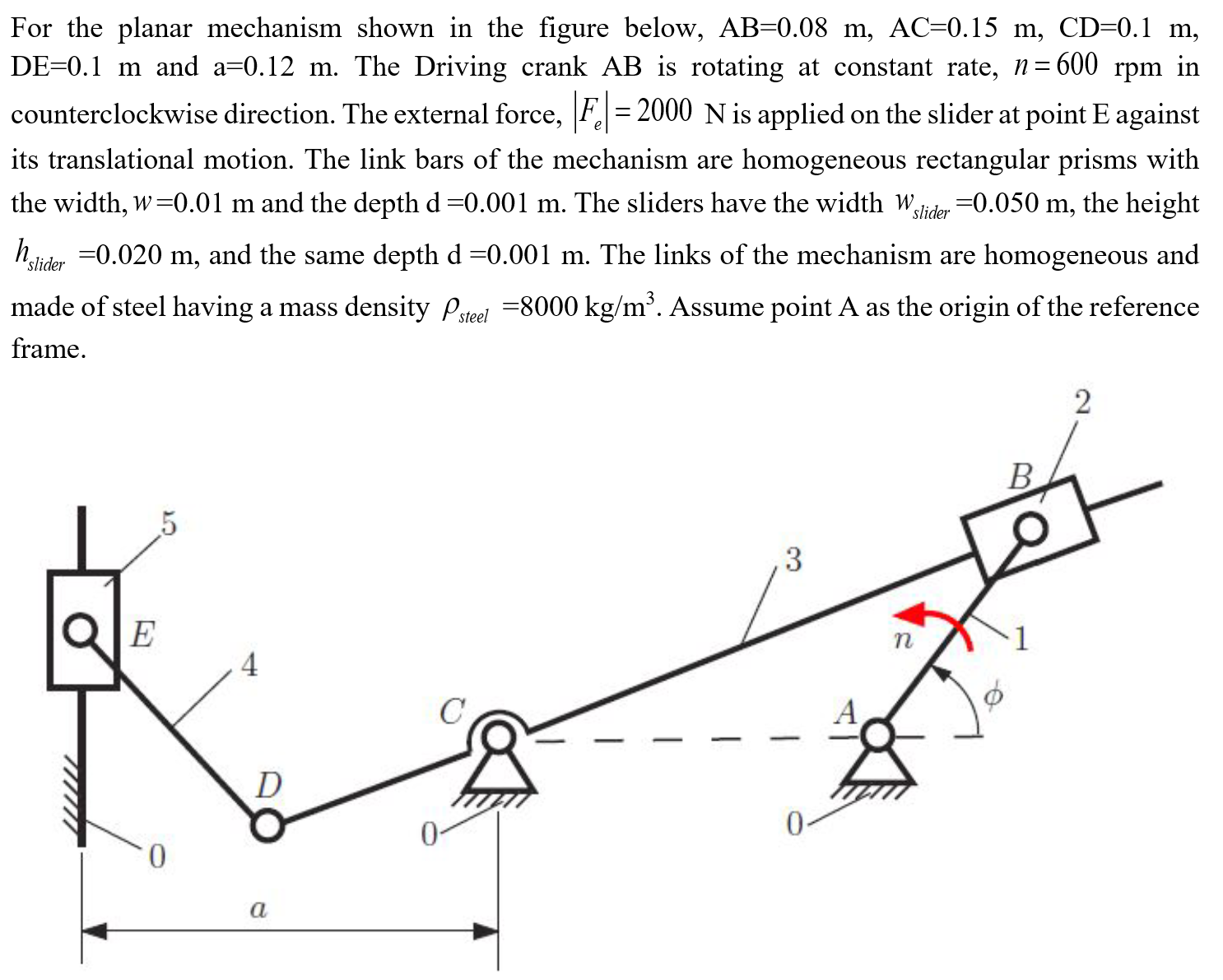 This exact same problem is on Chegg, but I believe it is wrong. I have attached it below. My main questions have to be: Why wasn't phi or the mass of the sliders/links accounted for (and how would you do that, if they need to be)? And why are they dividing by 0.02 in step 1?
