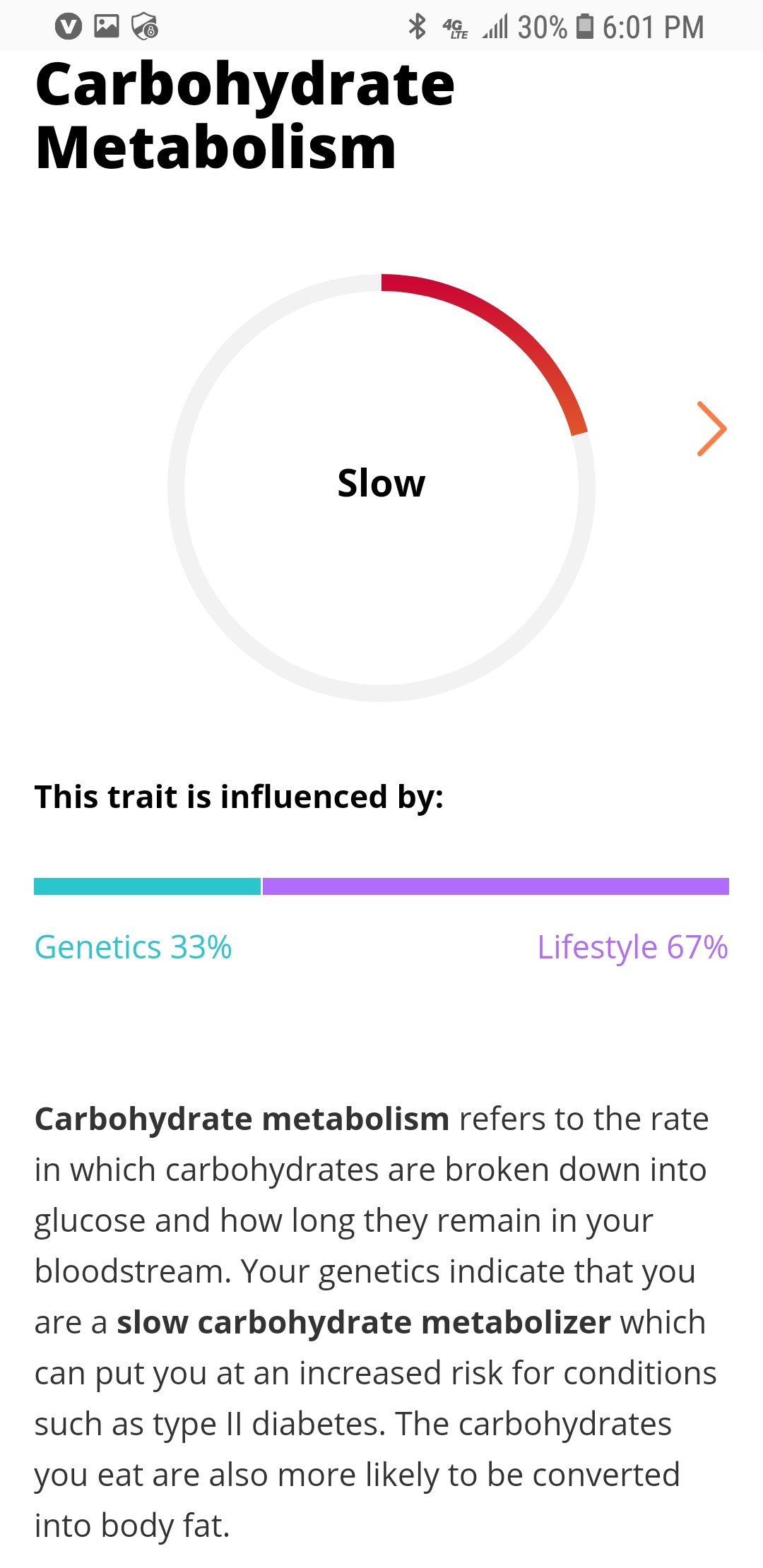 I completed a health and ancestry assessment from vitagene. I have a question about the traits and If they are what I am born with or changed through expression. SNP rs340874 gene name PROX1 which is the trait for carbohydrate metabolism. Mine came up as slow. Trait for fat metabolism and body weight came back fast. My question is, are my traits this way because I have adapted a ketogenic diet for the last 3 years? (High fat, low carb) have my Gene's changed or is this how I was born?
