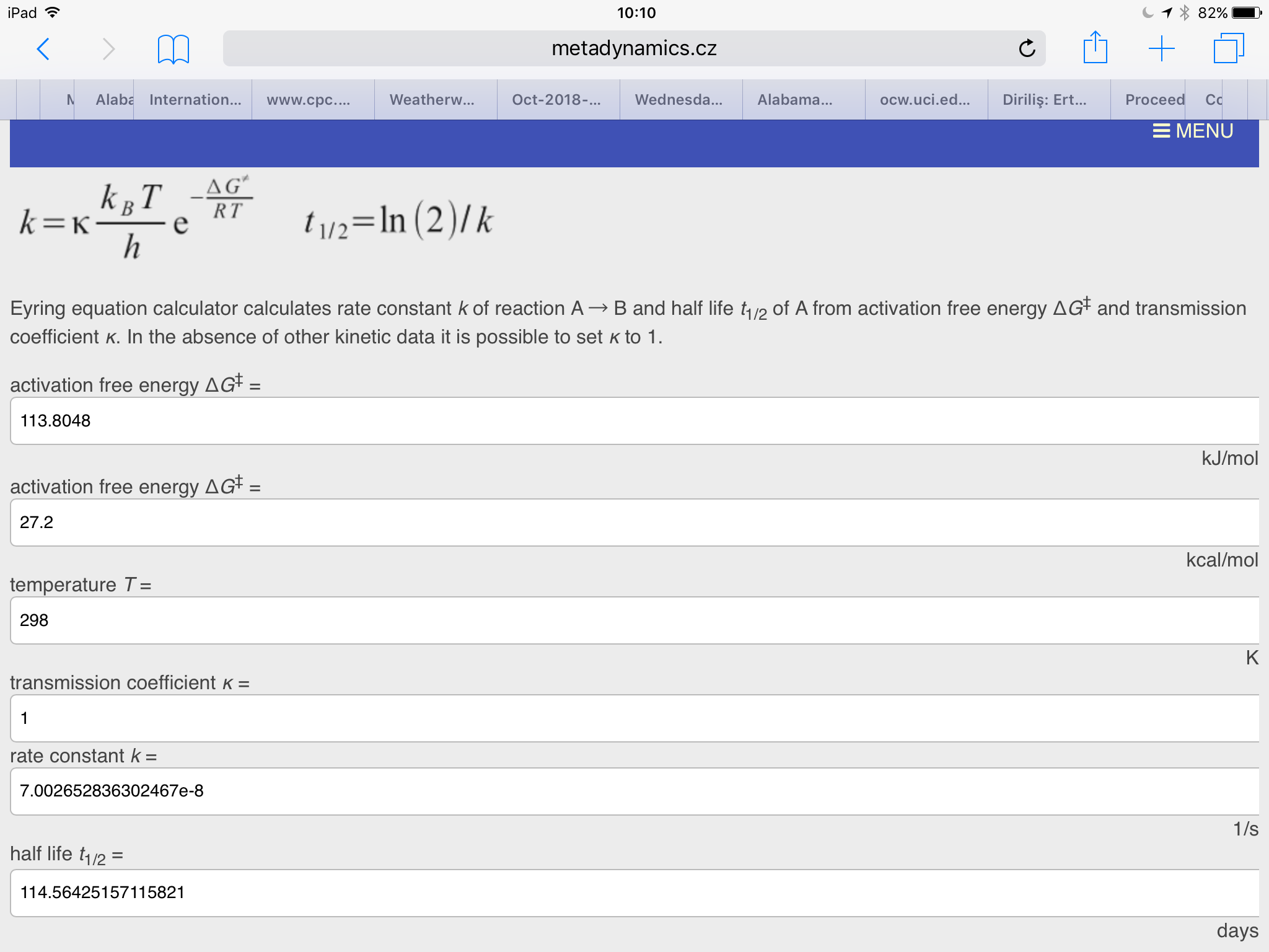In a lecture I recently watched there was an example of using the Eyring equation.