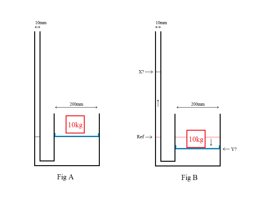 I have a pipe connects to a container's outlet. The container contains water and the pipe is open-ended. When a 10Kg object is placed inside the container and compress the water. Can you tell me how to calculate the displacement of X and Y? What principle or formula should I use?