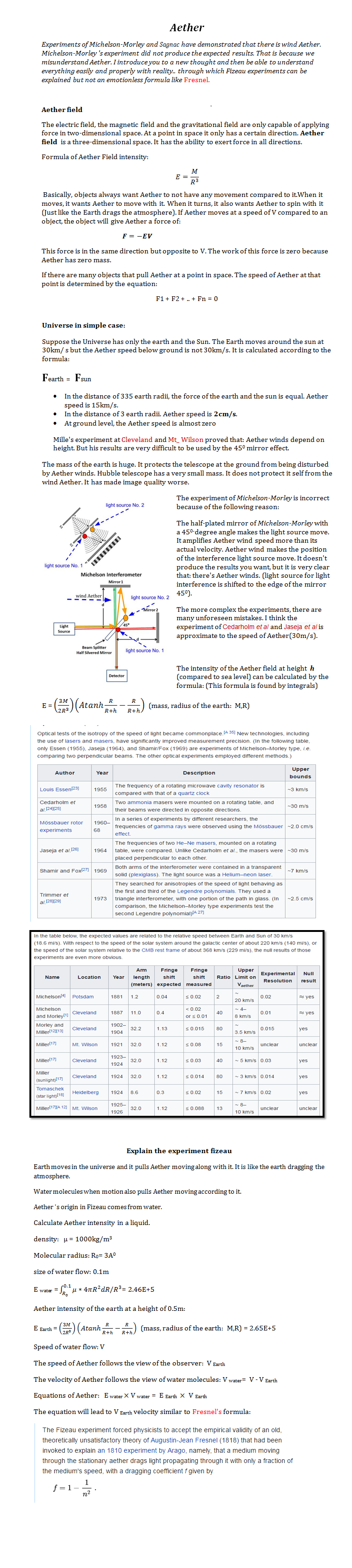 Các thí nghiệm của Michelson-Morley và Sagnac đã chứng minh rằng có gió Aether. Thí nghiệm của Michelson-Morley không mang lại kết quả như mong đợi. Đó là bởi vì chúng ta hiểu nhầm Aether. Tôi giới thiệu cho bạn một suy nghĩ mới và sau đó có thể hiểu mọi thứ dễ dàng và đúng đắn với thực tế .. qua đó các thí nghiệm của Fizeau có thể được giải thích nhưng không phải là một công thức vô cảm như Fresnel.