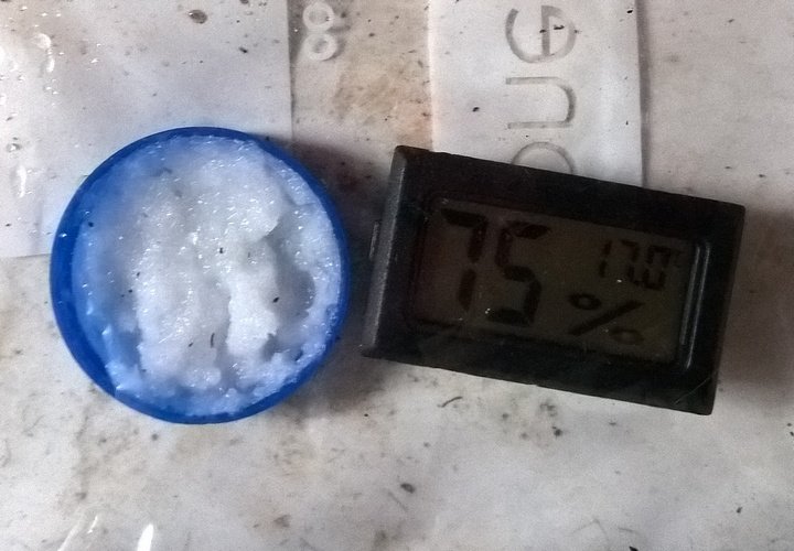 Here's my test setup. It's actually reading 75% now. If you move the apparatus the measured humidity changes a lot then settles back to 75%