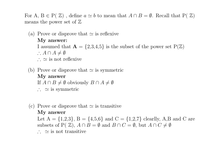 I would reword that as, "Suppose  [math]A = \{2, 3, 4, 5\}[/math]. Then [math]A \cap A = A \neq \emptyset[/math]. Or you could just say, For any nonempty set  [math]A[/math], we have [math]A \cap A = A \neq \emptyset[/math]. That would be sufficient for me.