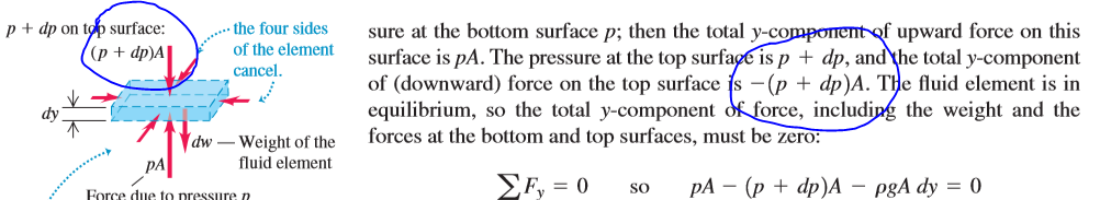 2) Brain compatible: Put the equation first and then define the variables: The forces on top and bottom should cancel out. There force up is the pressure force p*A from below. The force from up is the pressure force p2*A from above the small fluid element plus the weight dw of the small fluid element. Since we are talking about infinitesimal coordinates, and since p(y) should be a function, it makes sense to say that p2 = p+dp, which you can then integrate over.