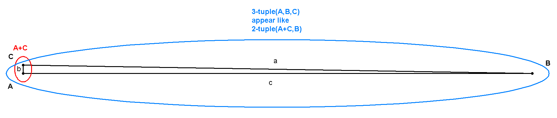 2-tuple property: Similarly when a 3-tuple system turn into a structure where 2 points are relatively near according to the 3rd, the structure appear like a 2 -tuple structure, similarity rise with the ratio x  (when distance between the close points is expressed with 1/x, and the distance to the far point with x, on my paper I use other expressions a,b,c).