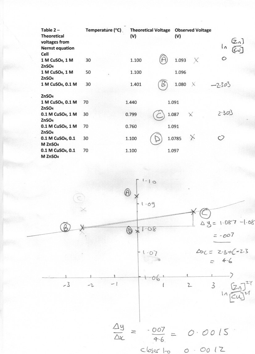 Could any off you check these calculations to see if there are any problems. I used a Zinc anode and Copper cathode so my value for number of electrons transferred in the balanced ionic equation should be 2. If you require any more info, just say :).
