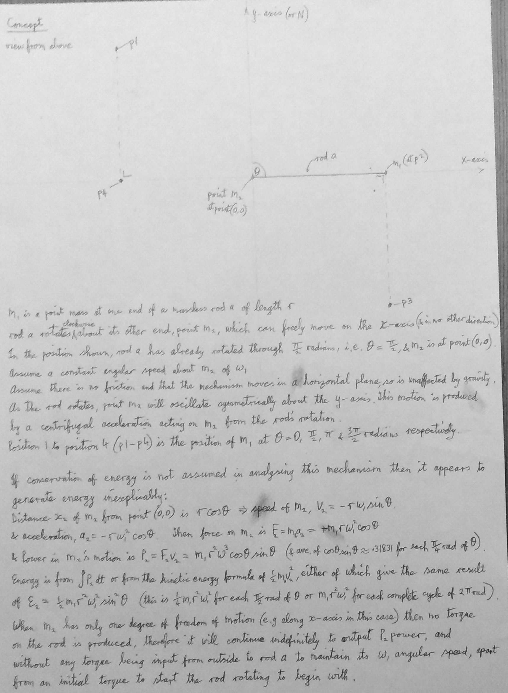 Discussion & request for help: If the analysis given above were correct that would mean energy is not conserved in this system since there is a quantifiable power output even if it is constantly changing in direction and magnitude, even though power is not being input to the system. Assuming therefore that the physics used here is flawed, then why and how exactly is it flawed since it is apparently the standard Newtonian mechanics that I know? Also exactly what is the correct physics for this mechanism? The answer to that must among other things be able to show exactly how torque arises which opposes the rod's rotation since it seems clear that as long as the rod rotates then it will provide power to m2's motion. Thanks in anticipation.