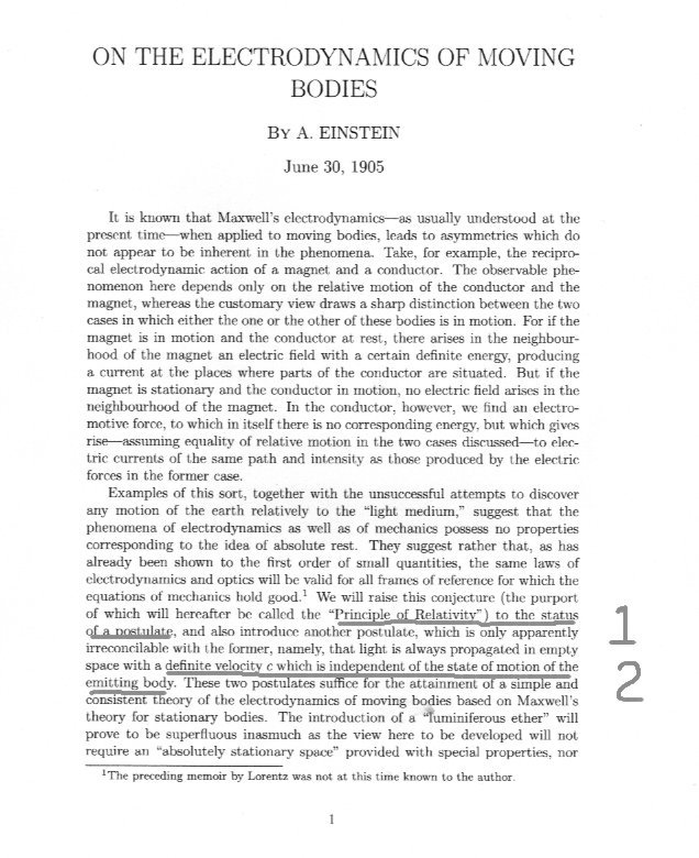 His proof of observer independence came after three pages of deductive reasoning on pages 6,7 and 8.