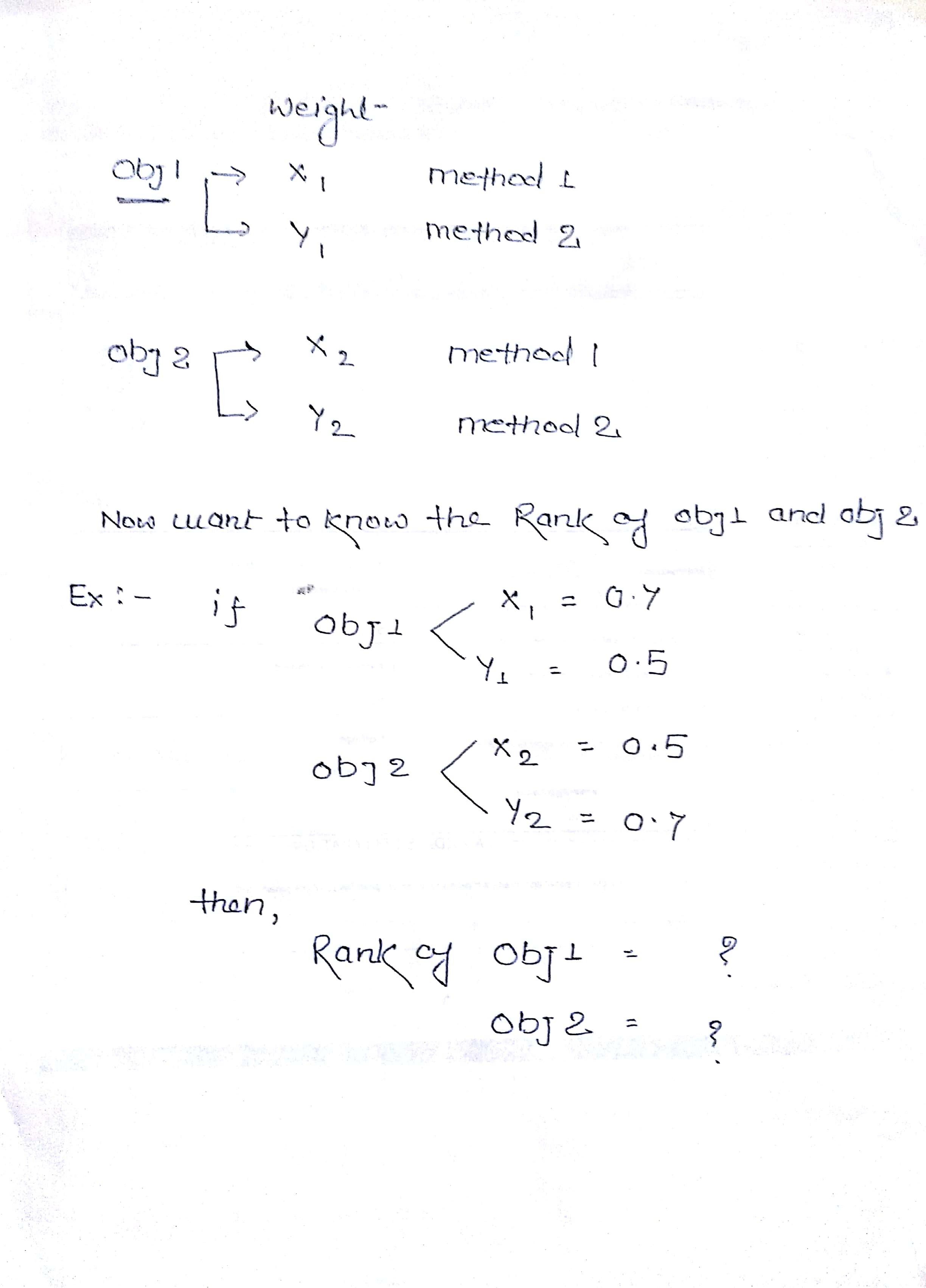 My objective is to Rank the obj1 and Obj2 according to there weight values determined from Method1 and Method2.