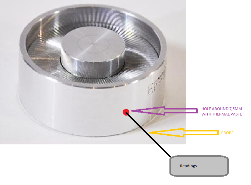 Okey this is exactly what I was looking for. I really see where you trying to get this. But just to make everything a lot more clear I have some pictures. You say a hole of 75mm deep. I think you mean 7.5mm deep because the ring is only 4cm wide and like 1.5cm high. The images don't include the object supporting the thermometer on the right side. I'm not 100% sure this will work as you can see in the 3rd image, the ring is split into two pieces. I can't use the top of the ring because there will be an aluminum thin circle plate on top of the whole ring (with the same 4cm diameter). I guess I can drill trough the two parts together and see if that would work. Hopefully this is clear.
