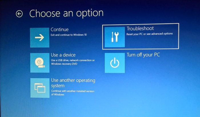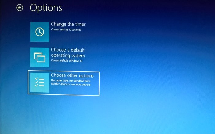 You can reset from the boot screen. Restart then wiggle your mouse on the boot screen - first picture - to pause it then press TAB key until you highlight the bottom option "Choose defaults and other options" and press Enter. Follow and the choose highlighted selections in the other images pressing enter each time. You can use the cursor keys to jump boxes in those screens.