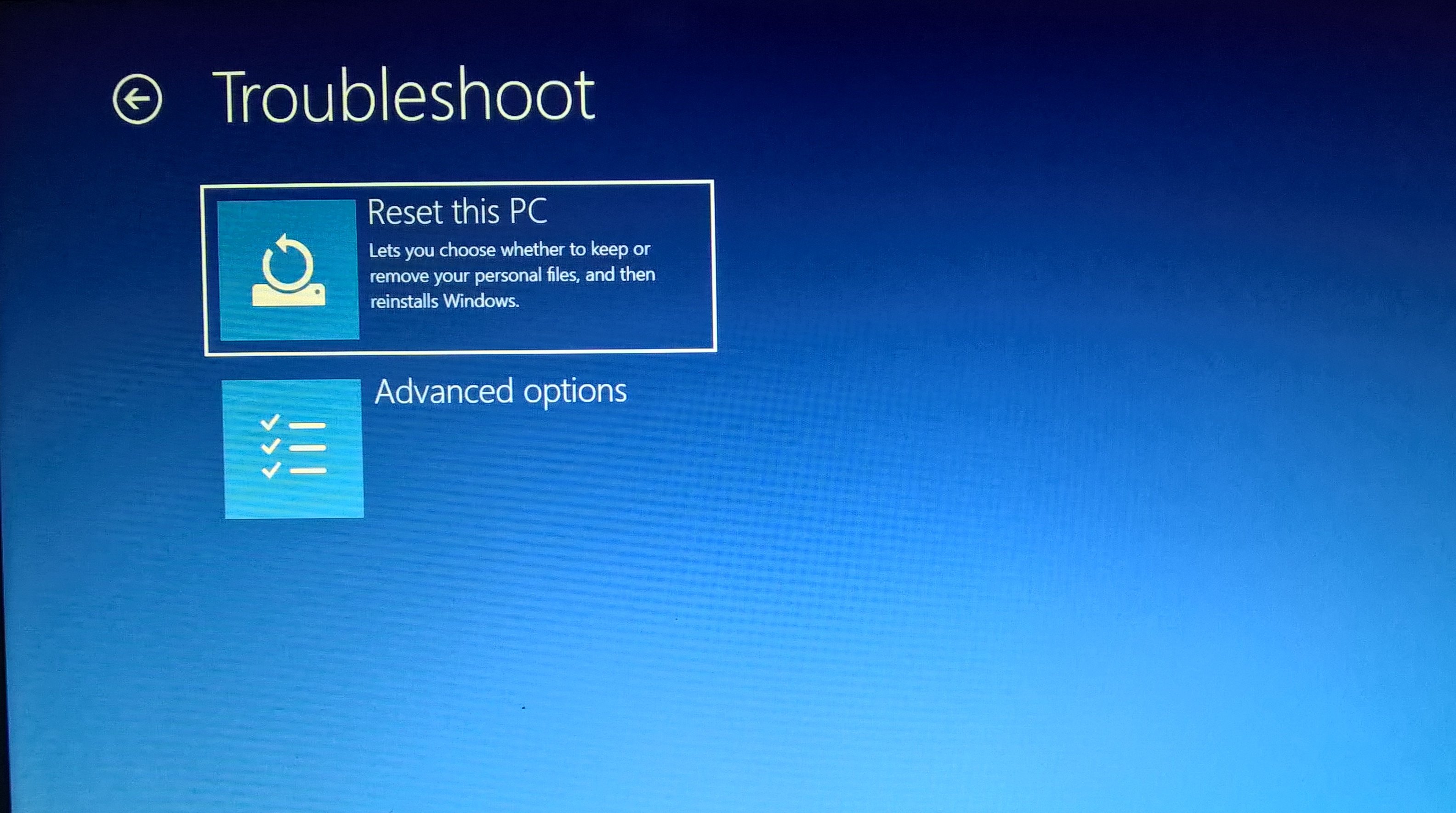 Ideas are getting thin on the gound. You could try updating to the latest version of Win 10 - the first option - or failing that get a usb stick and use the media creation tool to put W10 on it  and boot from that. You should get the option to keep your files in both instances. Here: