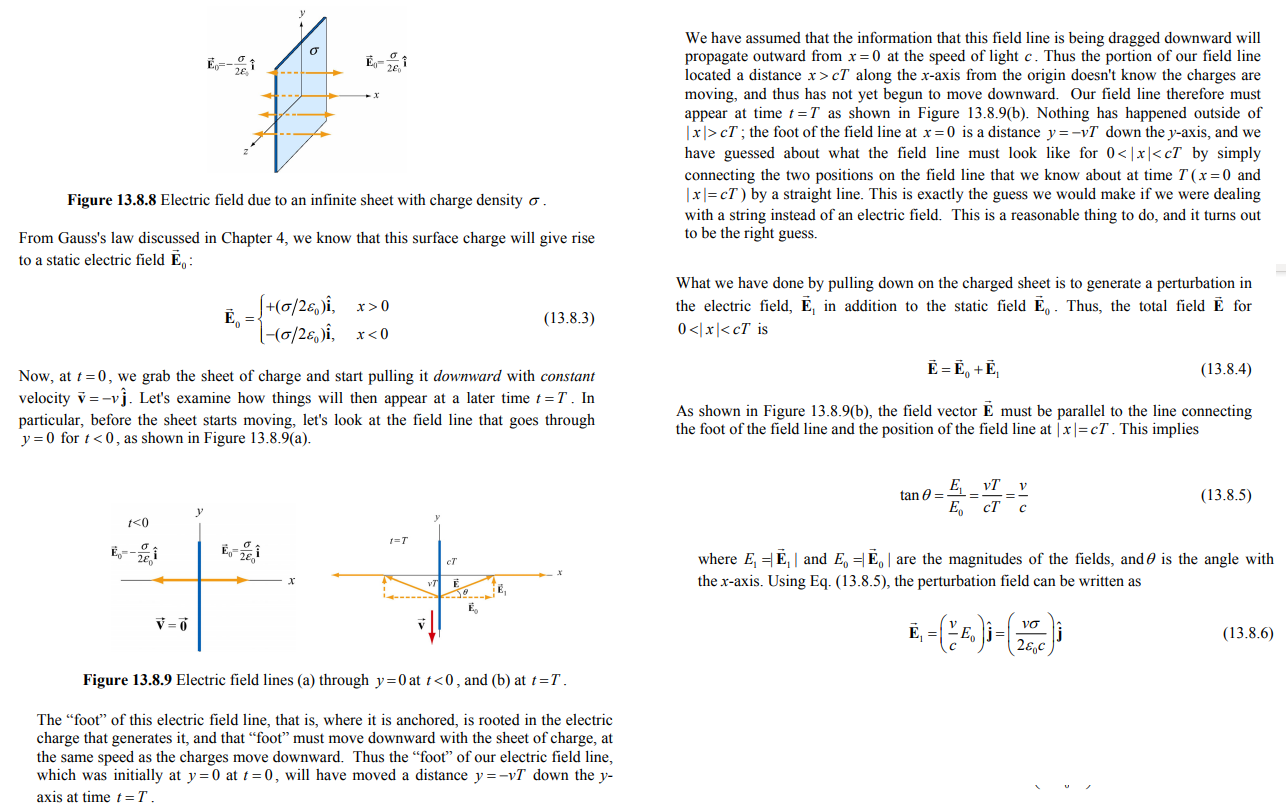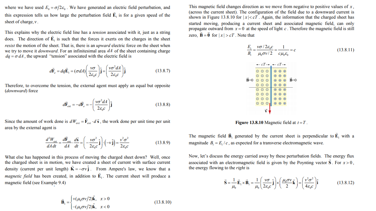 In the theory aove they calculate the perturbation of an E-field. Since there is kinetic energy involved I thought perhaps that the energy also could be emitted as an EM-wave. The issue is that they dont adress the mass of the moving part of the infinte sheet. If that mass was known one could use kinetic energy as well. Then I have for equalities: