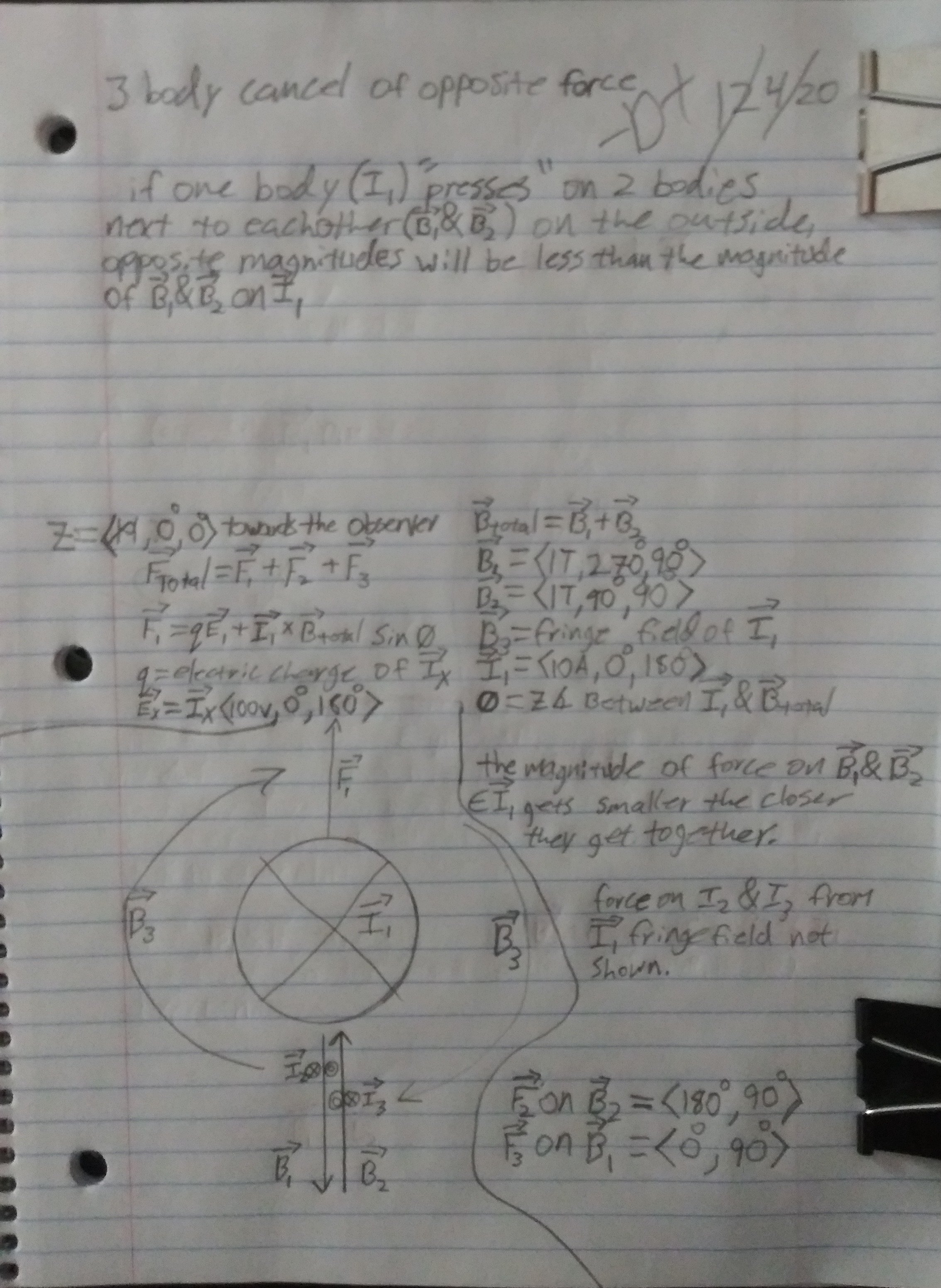 i gave you an example of the 2 person problem because you wanted to know how to apply 2 forces and get a lower net force magnitude on the center. you now need to apply the force the "wall would apply to the parsons" if it did in fact "apply force", which it does in the physics issue we have been debating. if the total B field acting on I is perpendicular to its velocity, I experiences force in the plane perpendicular to both. period. so it matters what angles they are at when you calculate opposing forces. the magnetic fields that add up to total B field are not at the same angles of reaction as total B field.