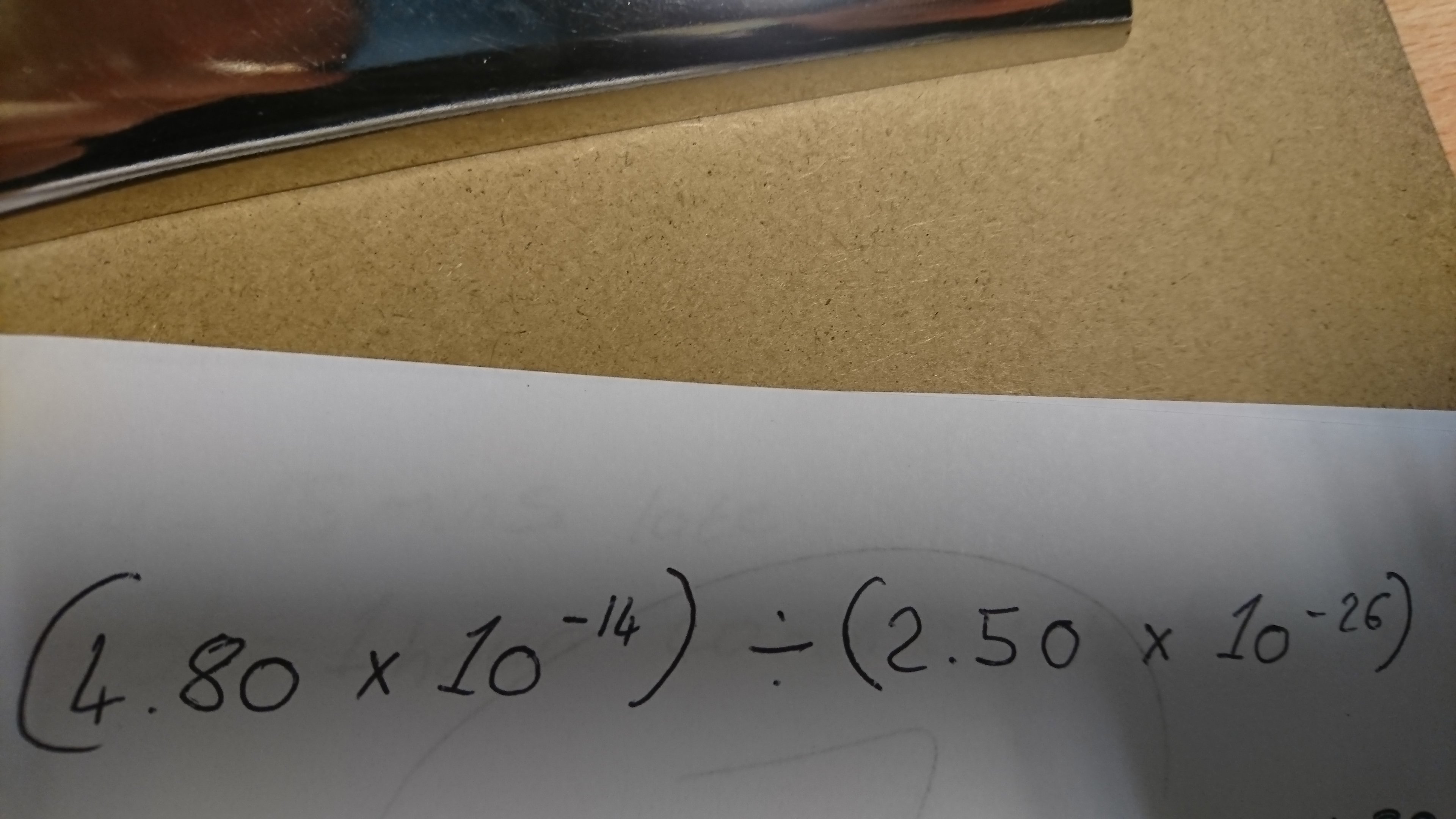 What makes scientific notation so nice is that you only have to divide the mantissa (the first bit of the number) and you can subtract the exponents (the "10 to the power" bit). So in the case, you divide 4.80 by 2.50 and subtract -26 from -14.
