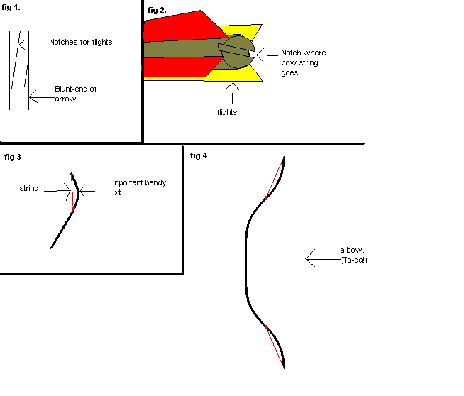 TO MAKE ARROWS: first off, make javelin-length things, out of a light-weight strait length of stuff. Bamboo canes, certain plant/bush stems etc work well. make flights out of something (ideally, they are kinda floppyish, like ridgid leaves or feathers; cardboard works well for javelins).