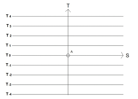 A sitting at X0 at T0, A sitting at X0 at T1, A sitting at X0 at T2, etc.