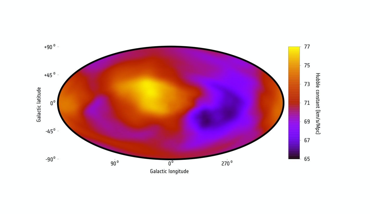 A map showing the rate of the expansion of the Universe in different directions across the sky.K. Migkas et al. 2020, CC BY-SA 3.0 IGO