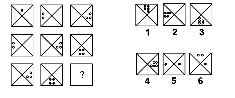 1: First row contains 1,2,3 dots second row 2,3,4 dots. So bottom row having 3,4,5 dots seems logical. That means that answer 5 and 6 are ruled out