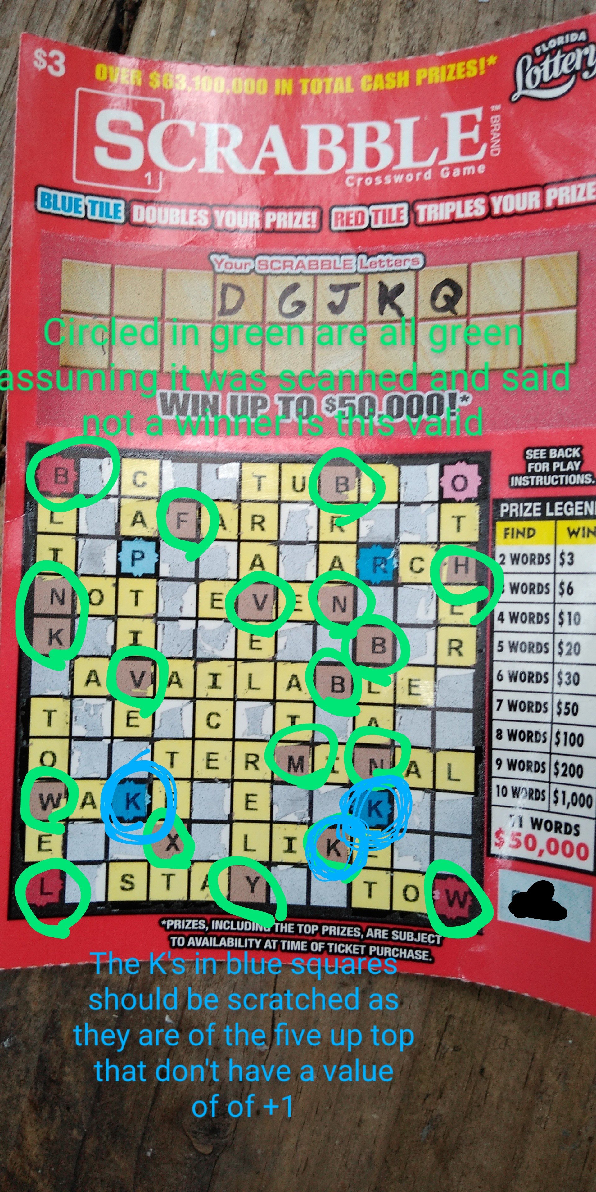 *Edit Circled in green are letters unscratched*