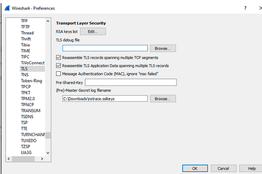I have installed 3.2.4 version of wireshark but in Edit-> Preference->Protocol I can't see the SSL protocol so I selected TLS. Now I can't see nstrace.sskeys in (pre) Master-Secret log filename. I am following the tutorial at: Decrypting SSL and TSL traffic