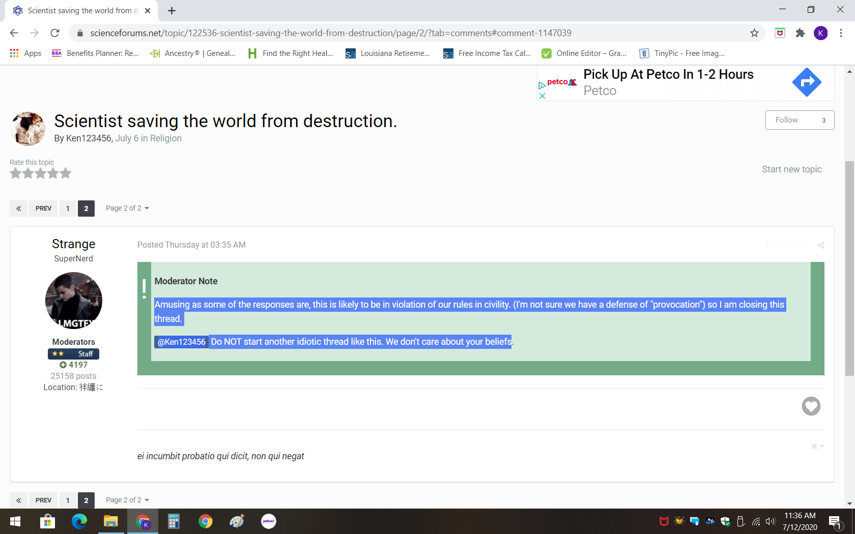 I suspect that as well. But here's the thing: the thread was idiotic, and more to the point, it was dishonest, as a question was being leveraged to push an agenda and preach, which violates two of our rules. This happened with the second post by Ken123456. It wasn't even subtle.