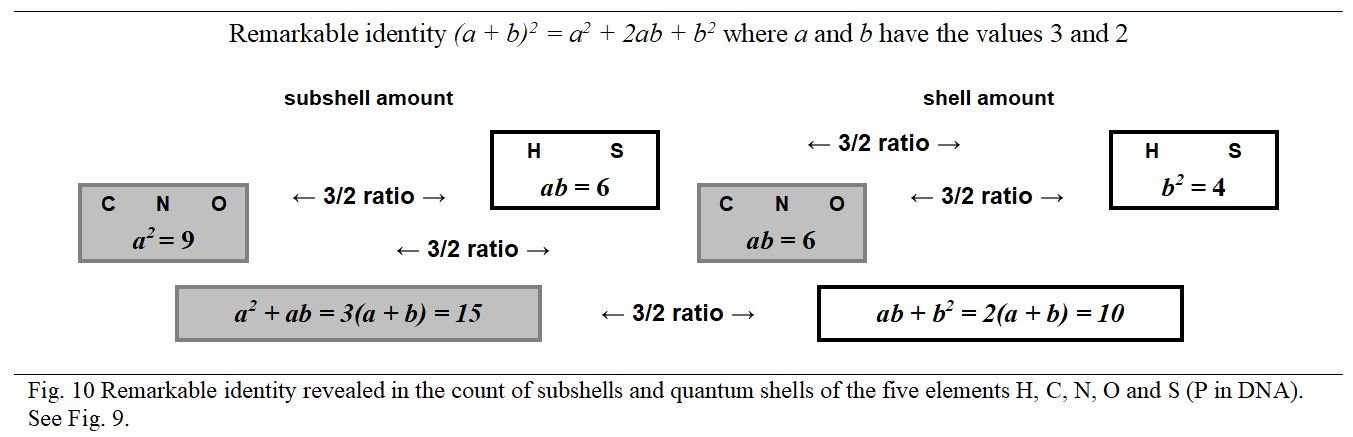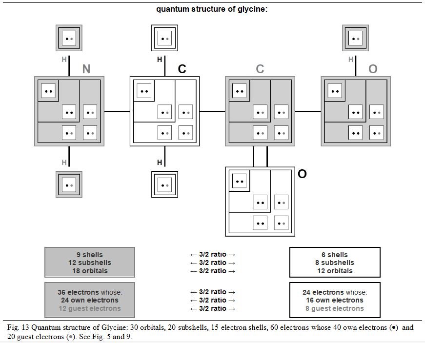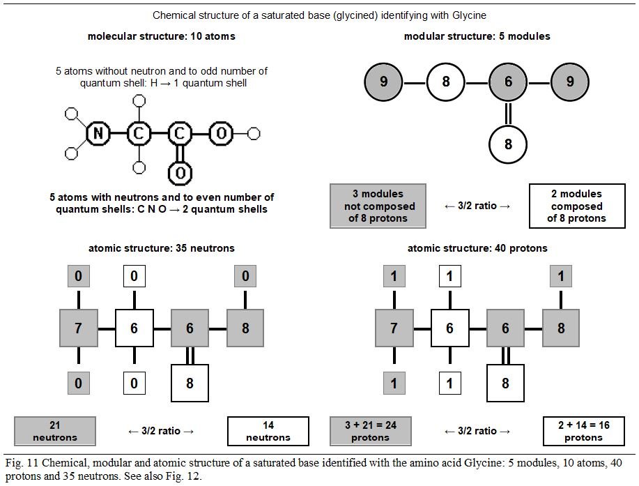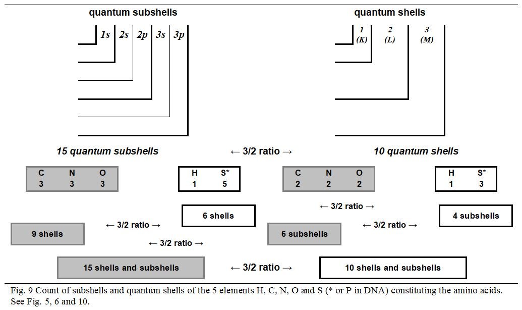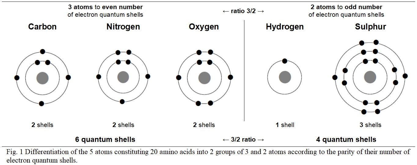 The analysis of the quantum structure of the five atomic elements composing the coded twenty amino acids and the four coding nucleotides of DNA working in the organization of the genetic code reveals an opposition of their respective constituents in always an arithmetic ratio of value 3/2 according to the parity of the number of their quantum shells. Also, the quantum analysis of the amino acid Glycine, the smallest component of peptides that can be confused with saturated base, reveals the same arithmetic oppositions of 3/2 value of its components by the differentiation, operated according to their number of protons, of its five chemical groups.