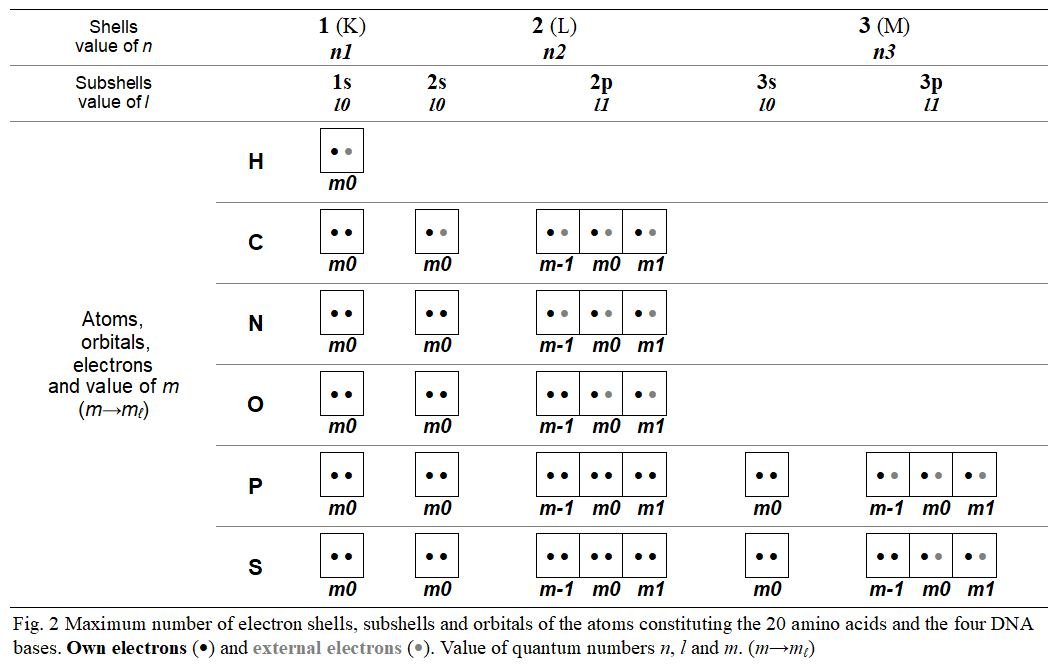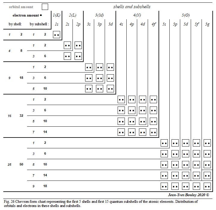 This quantum study of the genetic code is an opportunity to propose a new type of table describing the quantum organization of atoms. In this chart, illustrated in Figure 5, the different quantum shells and subshells are presented in the form of chevrons. At the top end of each rafter are indicated the names of the different shells and subsells; at the left end of these chevrons, the numbers of orbitals and electrons of these different shells and quantum subshells are indicated. At each chevron vertex is the orbital where the quantum number m = 0. The orbitals with positive quantum number m are progressively positioned towards the top of these chevron vertices and the orbitals with negative quantum number m are progressively positioned towards the outside left of these chevron vertices.