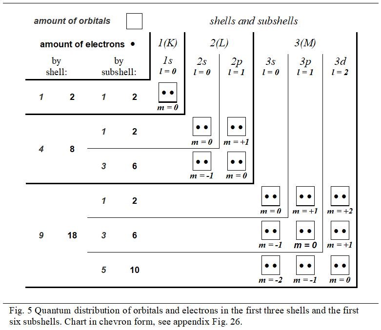 In the appendix, the same type of table is presented describing the quantum organization of the shells and subshells up to the 5th shell (O) and 15th subshell (5g). This innovative presentation, more explicit in describing the quantum structure of the atomic elements, will be used in various tables of this quantum study of the constituents of the genetic code.