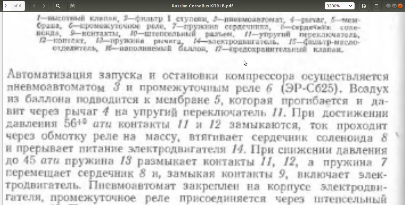 of Russian Cornelius KPV15. pdf 3200% high-altitude valve, 3-stage filter, 2-picamsanlomat, 4 5 mm Right, intermediate relay, 7-core spring, salt core- Honda, 9 contacts, plug connector, 11-elastic switch, 14-electric motor, 15-fashatr-oil- separator, It-filled with Bella, p-edskraintelny valve. Start and stop of the compressor is automated pneumoautomat 3 and intermediate relay 6 (ER-S625). Air from the balloon is fed to the membrane 5, which bends and Yes- Vit through the lever 4 to the elastic switch 11. At achievement pressure ATI contacts 11 and 12 are closed, the current passes through the relay winding to the ground, draws the core of the solenoid 8 and interrupts the power supply of the electric motor 14. When the pressure decreases up to 45 ATI, the spring 13 opens contacts II, 12, and the spring 7 moves the core 8 and, closing the contacts 9, turns on the electric trodvigatel. The pneumoautomat is fixed on the body of the electric device. an intermediate relay is connected via a plug-in