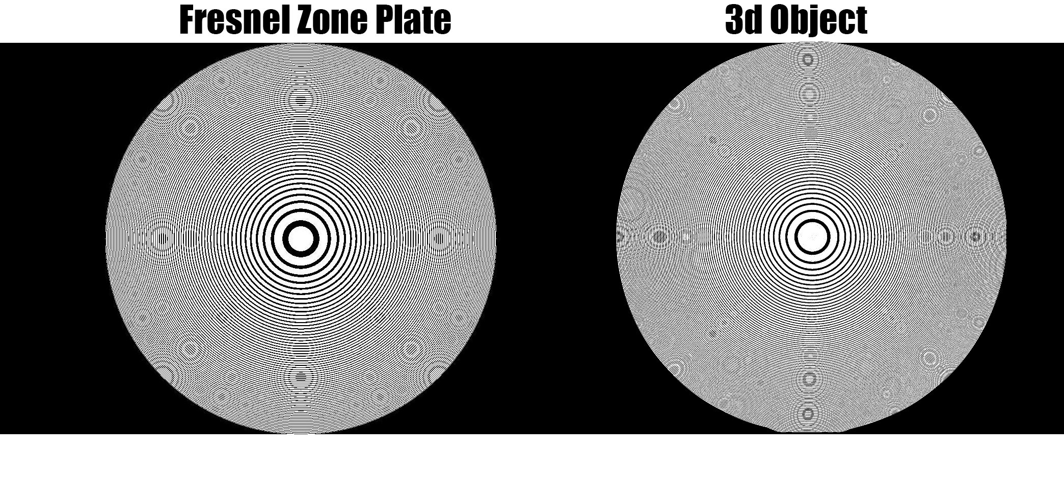 I’ve been wondering about the significance of generating interference fringes of 3d representations of “fresnel zones”. Would the parameters used in generating high res fresnel zones be useful in describing wave functions in the same way an actual zone plate would be? It's hard to imagine the math in the code wouldn’t be in some way related to the actual physical phenomena if the result is visually identical, but perhaps I’m mistaken. I’ve been exploring a 3d object and stumbled upon some emergent interference fringes (the fringes are not programmed intentionally) and I’m wondering if that means the object could be useful for modeling waves, wave interactions etc. Here’s some examples of what I mean, I’d be grateful for any feedback. Thanks :)