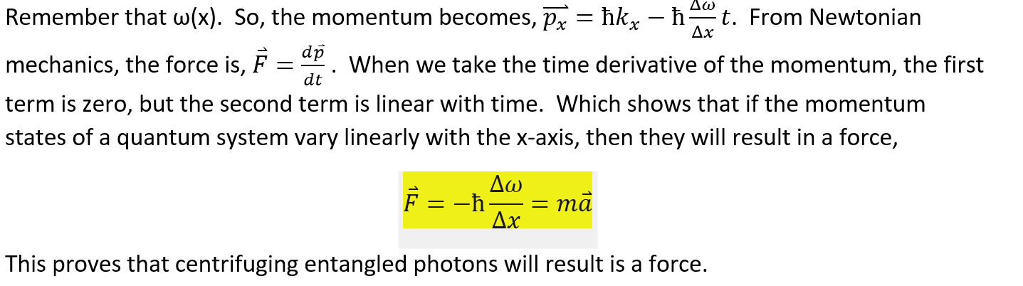 Because I believe that if you split a laser into two entangled beams P1 and P2, I believe there is a quantum entanglement field between them that can be described by a wave function.  Wave functions have momentum states.  I think that if you blueshift the P1 photons and Redshift the P2 photons, the result will be a frequency that varies as \omega(x). image.thumb.png.c1ffd69452de7c35283f00a724e61744.png