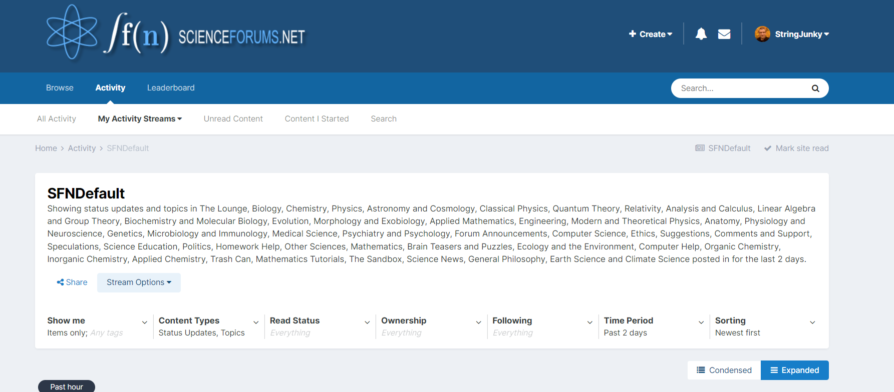 Genady. You can make a custom stream Click: Activity > My7 Activity Streams > Create Custom Stream > Select all the forum topics you want to see > Name and save it > Click on custom stream to open it > Bookmark it to your bookmarks bar. Click on that when you want to access SFN. I've filtered out Religion. It will present just the last post in each thread Like the old days. The top of my page looks like this with all chosen areas: