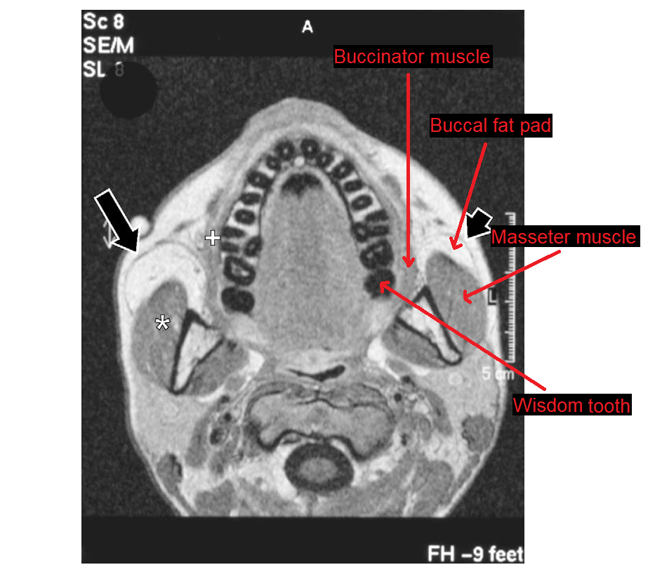 MRI axial of masseter m., bucal fat pad, bucciantor m. and third molar.png
